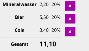 Wenn Sie einen Artikel entfernen möchten, klicken Sie auf das X-Symbol rechts neben der entsprechenden Position. Die Position wird daraufhin von der Rechnung entfernt. ![]() | |