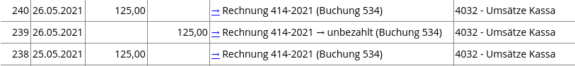 Die Rechnung wurde auf „bezahlt“ gesetzt, dadurch wurde ein Eingang im Kassenbuch von 125 € eingetragen (Beleg 238). Danach wurde die Rechnung wieder auf „unbezahlt“ gesetzt, und ein entsprechender Ausgang mit dem Text „Rechnung unbezahlt“ erstellt (Beleg 239). Danach wurde die Rechnung wieder zurück auf „bezahlt“ gesetzt, wodurch wieder ein Eingang von 125 € im Kassenbuch eingetragen wurde (Beleg 240). | |