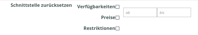 Einstellungen/Channel-Manager Um eine bestimmte Schnittstelle zurückzusetzen, wählen Sie diese im Abschnitt „Schnittstellen“ aus. Es erscheinen die Detaileinstellungen für diese Schnittstelle. Wählen Sie bei „Schnittstelle zurücksetzen“ aus, was Sie zurücksetzen wollen (Verfügbarkeiten, Preise und/oder Restriktionen). Optional können Sie auch einen Datumsbereich auswählen, der zurückgesetzt werden soll. (wenn Sie die Datumsfelder leer lassen, werden alle buchbaren Tage zurückgesetzt.)