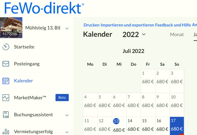 - Klicken Sie links im Menü auf „Kalender“ - Gegebenenfalls wählen Sie oben das gewünschte Objekt aus Es erscheint der Kalender: